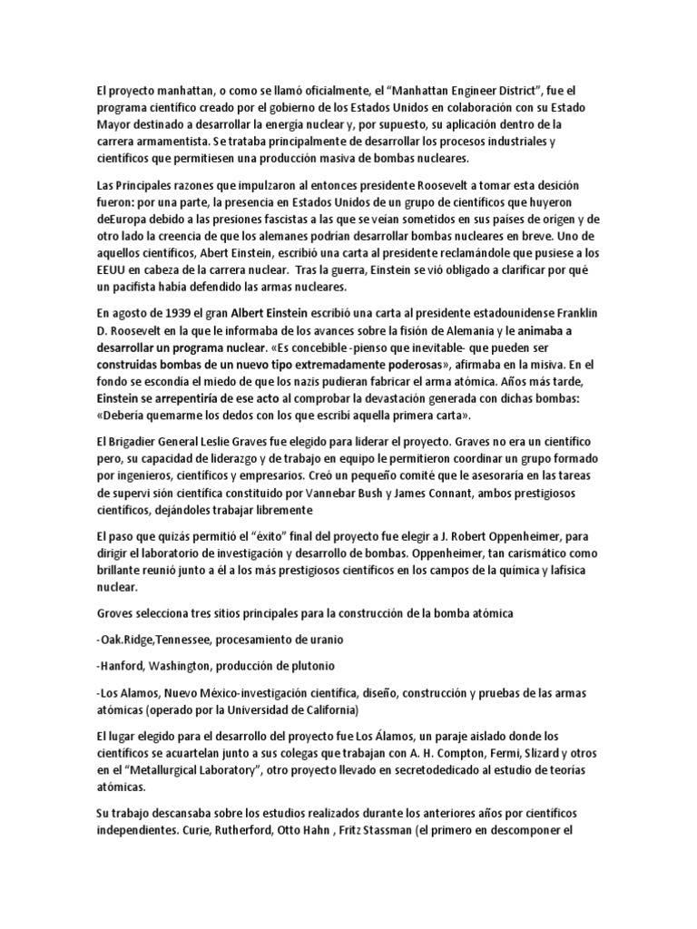 Estados Unidos en colaboracin con su Estado Mayor destinado a desarrollar la energa nuclear y, por supuesto, su aplicacin dentro de la carrera armamentista. Se trataba principalmente de desarrollar los procesos industriales y cientficos que permitiesen una produccin masiva de bombas nucleares. Las Principales razones que impulzaron al entonces presidente Roosevelt a tomar esta desicin fueron: por una parte, la presencia en Estados Unidos de un grupo de cientficos que huyeron deEuropa debido a las presiones fascistas a las que se vean sometidos en sus pases de orgen y de otro lado la creencia de que los alemanes podran desarrollar bombas nucleares en breve. Uno de aquellos cientficos, Abert Einstein, escribi una carta al presidente reclamndole que pusiese a los EEUU en cabeza de la carrera nuclear. Tras la guerra, Einstein se vi obligado a clarificar por qu un pacifista haba defendido las armas nucleares. En agosto de 1939 el gran Albert Einstein escribi una carta al presidente estadounidense Franklin D. Roosevelt en la que le informaba de los avances sobre la fisin de Alemania y le animaba a desarrollar un programa nuclear. Es concebible -pienso que inevitable- que pueden ser construidas bombas de un nuevo tipo extremadamente poderosas, afirmaba en la misiva. En el fondo se esconda el miedo de que los nazis pudieran fabricar el arma atmica. Aos ms tarde, Einstein se arrepentira de ese acto al comprobar la devastacin generada con dichas bombas: Debera quemarme los dedos con los que escrib aquella primera carta. El Brigadier General Leslie Graves fue elegido para liderar el proyecto. Graves no era un cientfico pero, su capacidad de liderazgo y de trabajo en equipo le permitieron coordinar un grupo formado por ingenieros, cientficos y empresarios. Cre un pequeo comit que le asesorara en las tareas de supervi sin cientfica constituido por Vannebar Bush y James Connant, ambos prestigiosos cientficos, dejndoles trabajar libremente El paso que quizs permiti el xito final del proyecto fue elegir a J. Robert Oppenheimer, para dirigir el laboratorio de investigacin y desarrollo de bombas. Oppenheimer, tan carismtico como brillante reuni junto a l a los ms prestigiosos cientficos en los campos de la qumica y lafsica nuclear. Groves selecciona tres sitios principales para la construccin de la bomba atmica -Oak.Ridge,Tennessee, procesamiento de uranio -Hanford, Washington, produccin de plutonio -Los Alamos, Nuevo Mxico-investigacin cientfica, diseo, construccin y pruebas de las armas atmicas (operado por la Universidad de California) El lugar elegido para el desarrollo del proyecto fue Los lamos, un paraje aislado donde los cientficos se acuartelan junto a sus colegas que trabajan con A. H. Compton, Fermi, Slizard y otros en el Metallurgical Laboratory, otro proyecto llevado en secretodedicado al estudio de teoras atmicas. Su trabajo descansaba sobre los estudios realizados durante los anteriores aos por cientficos independientes. Curie, Rutherford, Otto Hahn , Fritz Stassman (el primero en descomponer el
