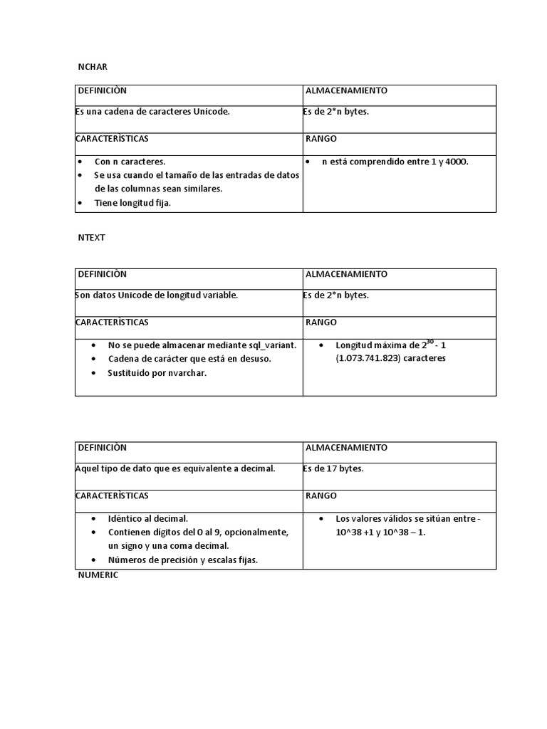 NCHAR DEFINICIN Es una cadena de caracteres Unicode. CARACTERSTICAS ALMACENAMIENTO Es de 2*n bytes. RANGO n est comprendido entre 1 y 4000.