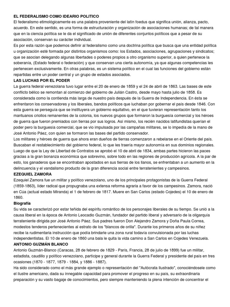 alianza, pacto, acuerdo. En este sentido, es una forma de estructuracin y organizacin de asociaciones humanas; de tal manera que en la ciencia poltica se le da el significado de unin de diferentes conjuntos polticos que a pesar de su asociacin, conservan su carcter individual. Es por esta razn que podemos definir al federalismo como una doctrina poltica que busca que una entidad poltica u organizacin est formada por distintos organismos como: los Estados, asociaciones, agrupaciones y sindicatos; que se asocian delegando algunas libertades o poderes propios a otro organismo superior, a quien pertenece la soberana, (Estado federal o federacin) y que conservan una cierta autonoma, ya que algunas competencias les pertenecen exclusivamente. En otras palabras, es un sistema poltico en el cual las funciones del gobierno estn repartidas entre un poder central y un grupo de estados asociados. LAS LUCHAS POR EL PODER La guerra federal venezolana tuvo lugar entre el 20 de enero de 1859 y el 24 de abril de 1863. Las bases de este conflicto blico se remontan al comienzo del gobierno de Julin Castro, desde mayo hasta julio de 1858. Es considerada como la contienda ms larga de nuestro pas despus de la Guerra de Independencia. En sta se enfrentaron los conservadores y los liberales, bandos polticos que luchaban por gobernar el pas desde 1846. Con esta guerra se persegua que se instituyera un gobierno equitativo, en el que tuvieran representacin tanto los mantuanos criollos remanentes de la colonia, los nuevos grupos que formaron la burguesa comercial y los hroes de guerra que fueron premiados con tierras por sus logros. As mismo, los recin nacidos latifundistas queran el poder pero la burguesa comercial, que se vio impulsada por las campaas militares, se lo impeda de la mano de Jos Antonio Pez, con quien se formaron las bases del partido conservador. Los militares y hroes de guerra que ahora eran dueos de tierras comenzaron a rebelarse en el Oriente del pas. Buscaban el restablecimiento del gobierno federal, lo que les traera mayor autonoma en sus dominios regionales. Luego de que la Ley de Libertad de Contratos se aprob el 10 de abril de 1834, ambas partes hicieron las paces gracias a la gran bonanza econmica que sobrevino, sobre todo en las regiones de produccin agrcola. A la par de esto, los ganaderos que se encontraban apostados en sus tierras de los llanos, se enfrentaban a un aumento en la delincuencia y el vandalismo producto de la gran diferencia social entre terratenientes y campesinos. EZEQUIEL ZAMORA Ezequiel Zamora fue un militar y poltico venezolano, uno de los principales protagonistas de la Guerra Federal (1859-1863), lder radical que propugnaba una extensa reforma agraria a favor de los campesinos. Zamora, naci en Ca (actual estado Miranda) el 1 de febrero de 1817. Muere en San Carlos (estado Cojedes) el 10 de enero de 1860. Biografa Su vida se caracteriz por estar teida del espritu romntico de los personajes liberales de su tiempo. Se uni a la causa liberal en la poca de Antonio Leocadio Guzmn, fundador del partido liberal y adversario de la oligarqua terrateniente dirigida por Jos Antonio Pez. Sus padres fueron Don Alejandro Zamora y Doa Paula Correa, modestos tenderos pertenecientes al estrato de los "blancos de orilla". Durante los primeros aos de su niez recibe la rudimentaria instruccin que poda brindarle una zona rural todava convulsionada por las luchas independentistas. El 10 de enero de 1860 una bala le quita la vida camino a San Carlos en Cojedes Venezuela. ANTONIO GUZMN BLANCO Antonio Guzmn-Blanco (Caracas, 28 de febrero de 1829 - Pars, Francia, 28 de julio de 1899) fue un militar, estadista, caudillo y poltico venezolano, partcipe y general durante la Guerra Federal y presidente del pas en tres ocasiones (1870 - 1877, 1879 - 1884, y 1886 - 1887). Ha sido considerado como el ms grande ejemplo o representacin del "Autcrata Ilustrado", conocindosele como el ilustre americano, dada su innegable capacidad para promover el progreso en su pas, su extraordinaria preparacin y su vasto bagaje de conocimientos, pero siempre manteniendo la plena intencin de concentrar el