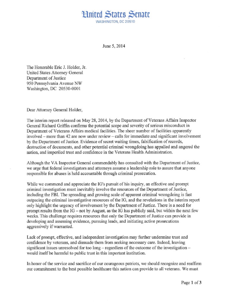 Senator Tom Udall joins a bipartisan letter to Attorney General Eric Holder on the Department of Veteran Affairs scandal over secret waiting times, falsification of records and other potenti…Descripción completa