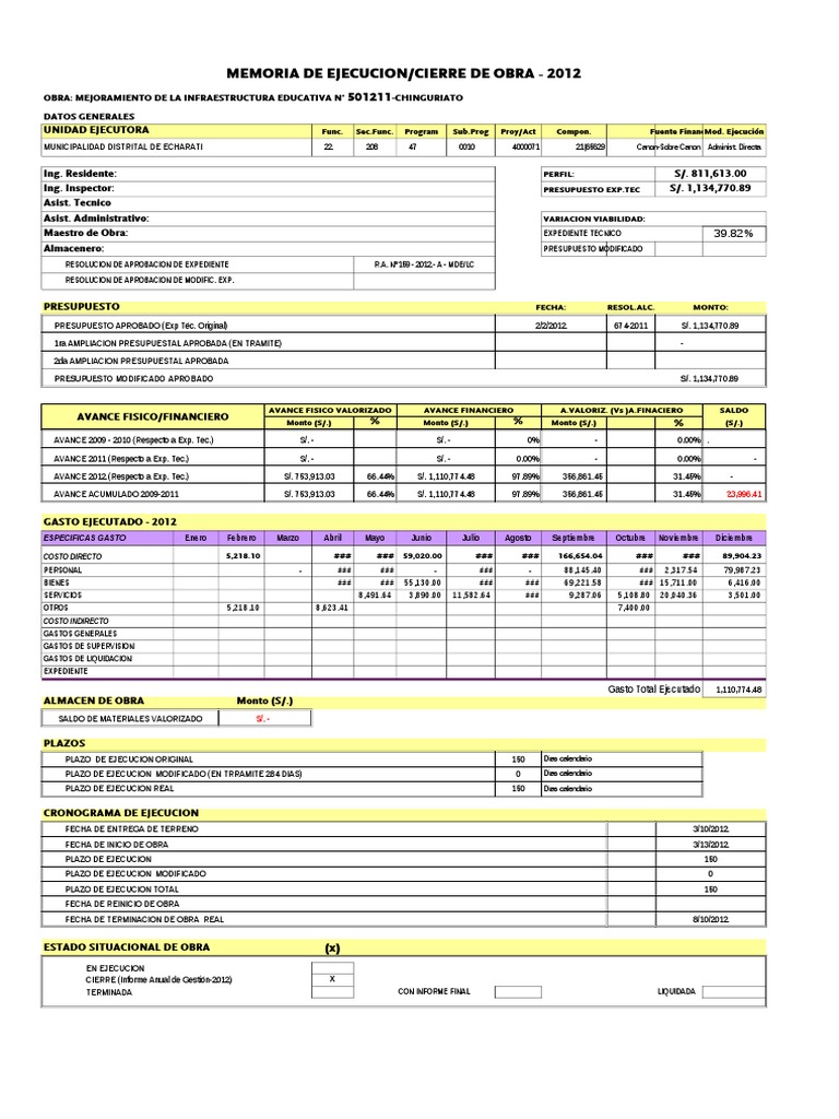 MEMORIA DE EJECUCION/CIERRE DE OBRA - 2012