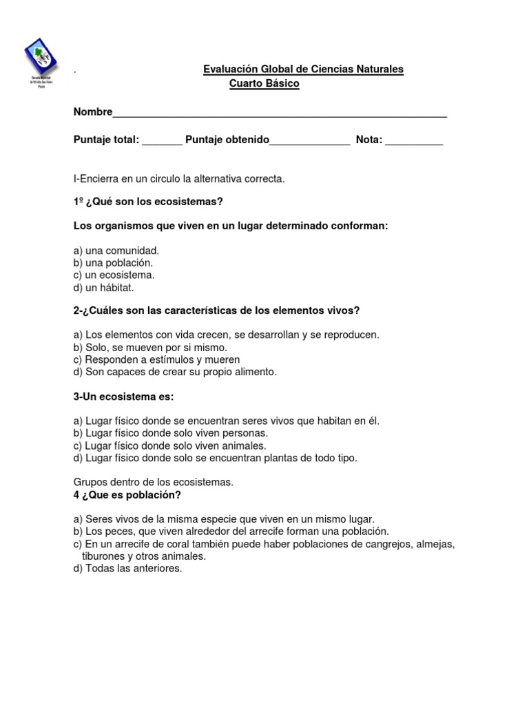 7 Corresponde al espacio fsico donde conviven seres vivos, que aprovechan los factores sin vida para poder sobrevivir, como el agua, el aire etc., esta definicin corresponde al concepto de: a) Poblacin. b) Ecosistema. c) Comunidad. d) Ser vivo. 8.- Sus caractersticas principales son que nacen, crecen, se desarrollan y mueren, esta afirmacin corresponde al concepto de: a) Poblacin. b) Ecosistema. c) Comunidad. d) Ser vivo.