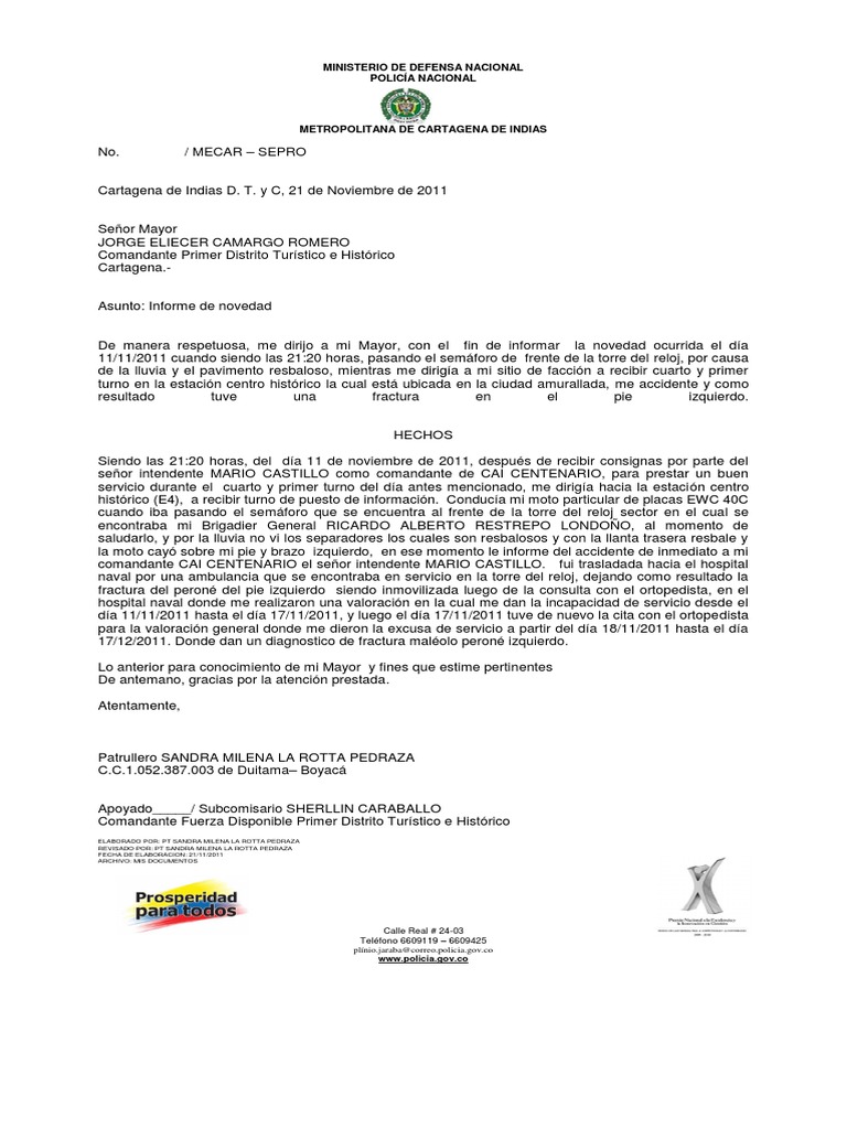 De manera respetuosa, me dirijo a mi Mayor, con el fin de informar la novedad ocurrida el da