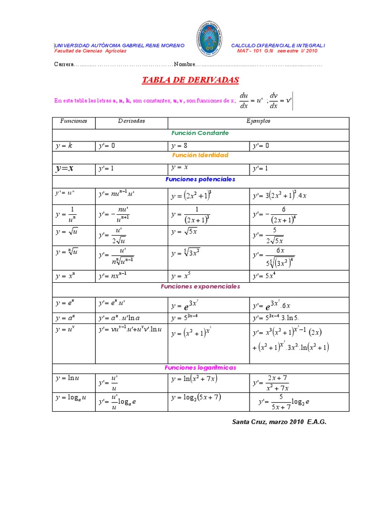 En esta tabla las letras a, n, k, son constantes; u, v, son funciones de x; ' u
