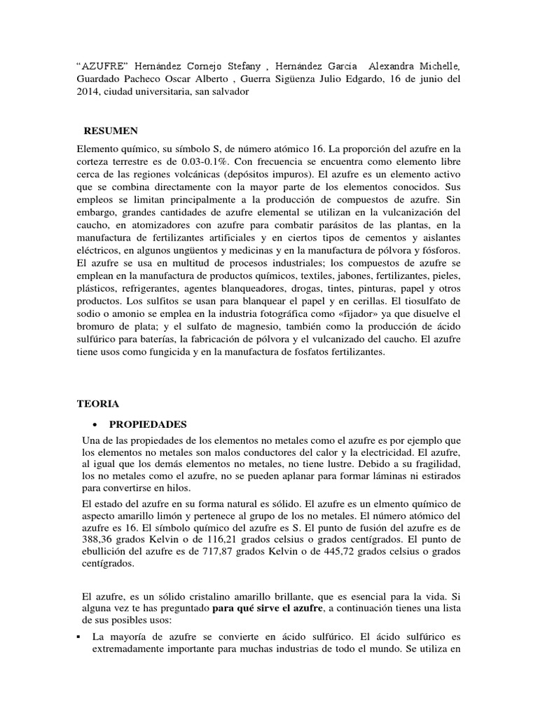azufre es 16. El smbolo qumico del azufre es S. El punto de fusin del azufre es de