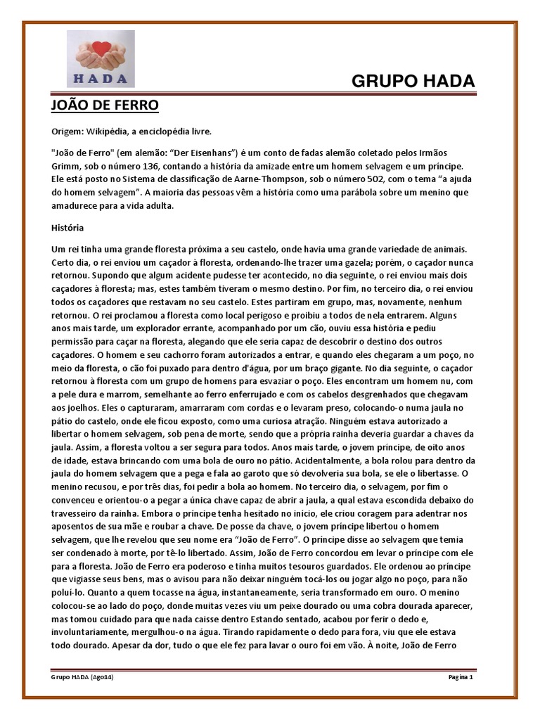 selvagem, que lhe revelou que seu nome era Joo de Ferro. O prncipe disse ao selvagem que temia
