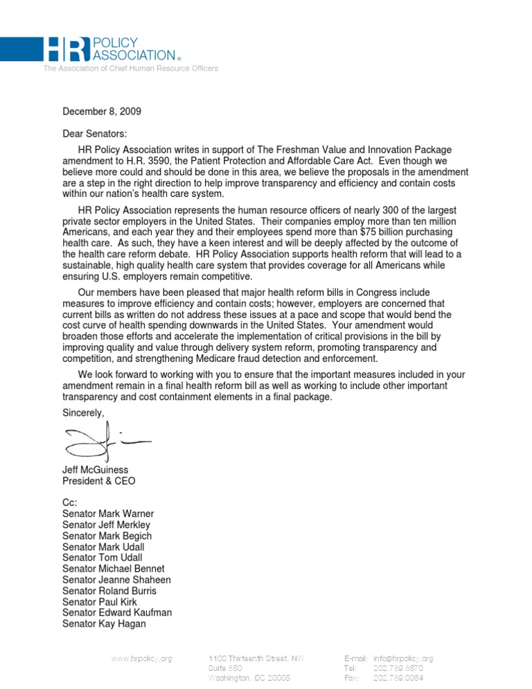 The HR Policy Association writes a letter of support for a package of amendments introduced by 11 Freshman Senators to bring greater innovation and affordability to the health care system. T…Descripción completa
