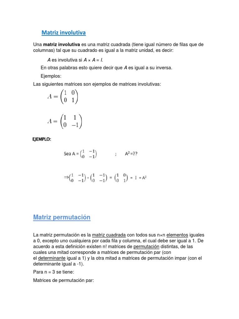 Una matriz involutiva es una matriz cuadrada (tiene igual nmero de filas que de