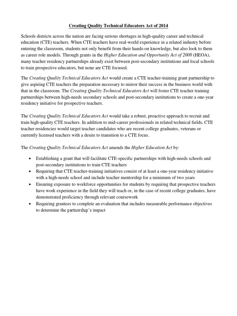 Fact Sheet: Creating Quality Technical Educators Act of 2014