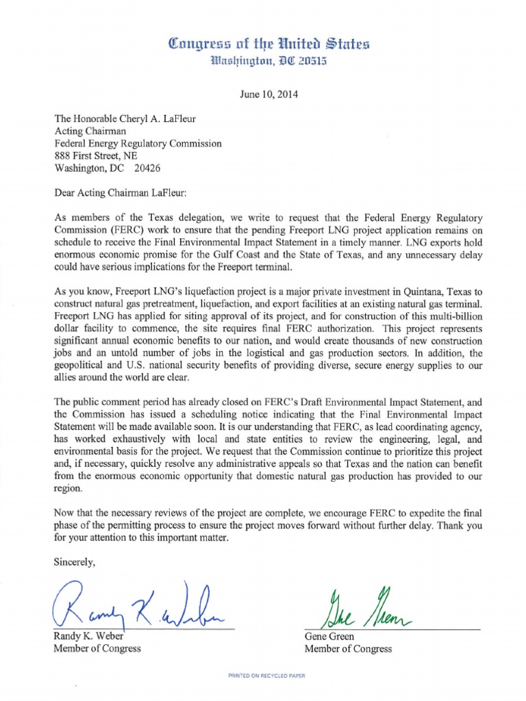 June 10, 2014: Congressman Culberson joined with other members of the Texas delegation in urging the Federal Energy Regulatory Commission (FERC) to keep the Freeport LNG terminal on schedule…Descripción completa