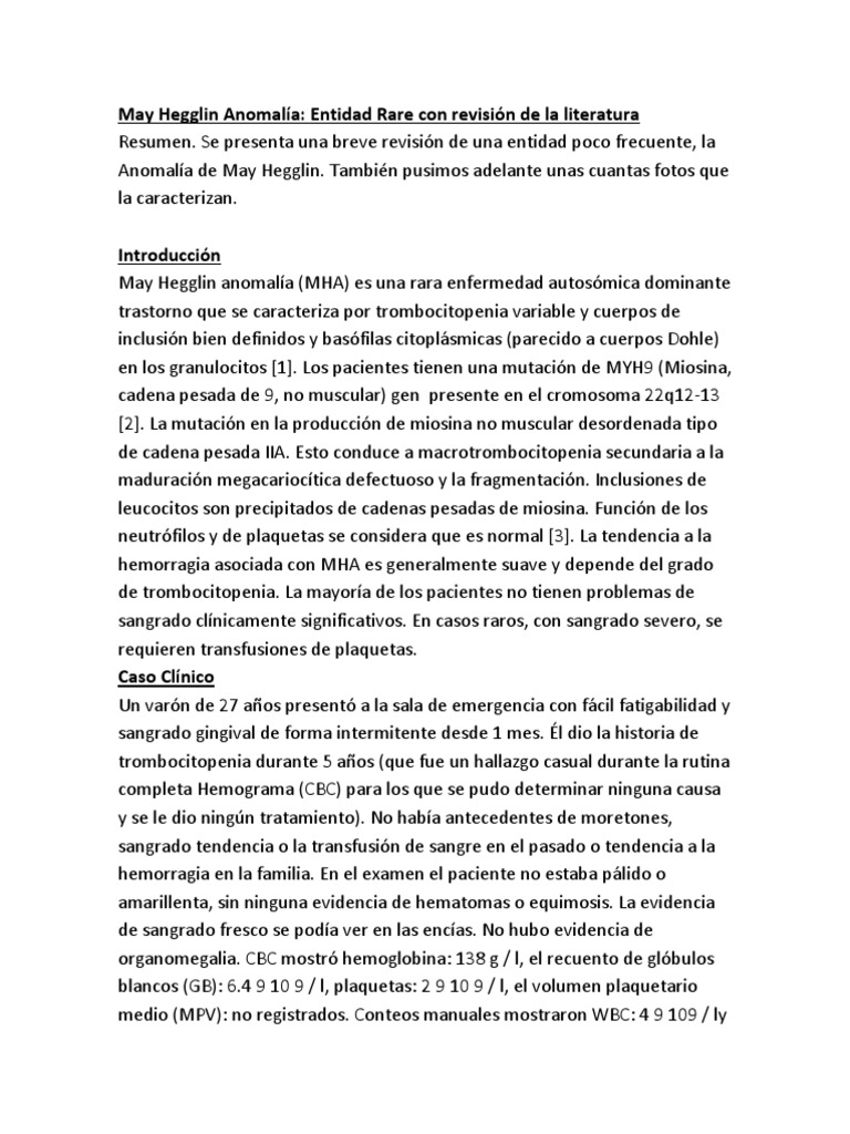 May Hegglin anomala (MHA) es una rara enfermedad autosmica dominante