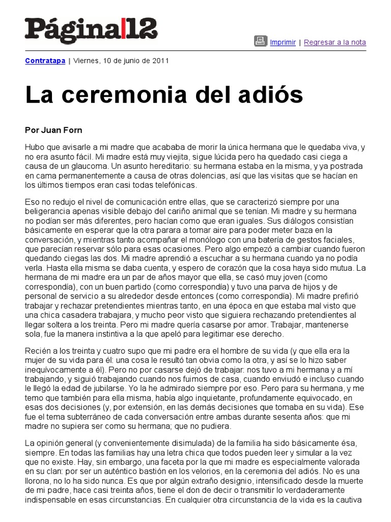 La ceremonia del adis Por Juan Forn Hubo que avisarle a mi madre que acababa de morir la nica hermana que le quedaba viva, y no era asunto fcil. Mi madre est muy viejita, sigue lcida pero ha quedado casi ciega a causa de un glaucoma. Un asunto hereditario: su hermana estaba en la misma, y ya postrada en cama permanentemente a causa de otras dolencias, as que las visitas que se hacan en los ltimos tiempos eran casi todas telefnicas. Eso no redujo el nivel de comunicacin entre ellas, que se caracteriz siempre por una beligerancia apenas visible debajo del cario animal que se tenan. Mi madre y su hermana no podan ser ms diferentes, pero hacan como que eran iguales. Sus dilogos consistan bsicamente en esperar que la otra parara a tomar aire para poder meter baza en la conversacin, y mientras tanto acompaar el monlogo con una batera de gestos faciales, que parecan reservar slo para esas ocasiones. Pero algo empez a cambiar cuando fueron quedando ciegas las dos. Mi madre aprendi a escuchar a su hermana cuando ya no poda verla. Hasta ella misma se daba cuenta, y espero de corazn que la cosa haya sido mutua. La hermana de mi madre era un par de aos mayor que ella, se cas muy joven (como corresponda), con un buen partido (como corresponda) y tuvo una parva de hijos y de personal de servicio a su alrededor desde entonces (como corresponda). Mi madre prefiri trabajar y rechazar pretendientes mientras tanto, en una poca en que estaba mal visto que una chica casadera trabajara, y mucho peor visto que siguiera rechazando pretendientes al llegar soltera a los treinta. Pero mi madre quera casarse por amor. Trabajar, mantenerse sola, fue la manera instintiva a la que apel para legitimar ese derecho. Recin a los treinta y cuatro supo que mi padre era el hombre de su vida (y que ella era la mujer de su vida para l: una cosa le result tan obvia como la otra, y as se lo hizo saber inequvocamente a l). Pero no por casarse dej de trabajar: nos tuvo a mi hermana y a m trabajando, y sigui trabajando cuando nos fuimos de casa, cuando enviud e incluso cuando le lleg la edad de jubilarse. Yo la he admirado siempre por eso. Pero para su hermana, y me temo que tambin para ella misma, haba algo inquietante, profundamente equivocado, en esas dos decisiones (y, por extensin, en las dems decisiones que tomaba en su vida). Ese fue el tema subterrneo de cada conversacin entre ambas durante sesenta aos: que mi madre no supiera ser como su hermana; que no pudiera. La opinin general (y convenientemente disimulada) de la familia ha sido bsicamente sa, siempre. En todas las familias hay una letra chica que todos pueden leer y simular a la vez que no existe. Hay, sin embargo, una faceta por la que mi madre es especialmente valorada en su clan: por ser un autntico bastin en los velorios, en la ceremonia del adis. No es una llorona, no lo ha sido nunca. Es que por algn extrao designio, intensificado desde la muerte de mi padre, hace casi treinta aos, tiene el don de decir o transmitir lo verdaderamente indispensable en esas circunstancias. En cualquier otra circunstancia de la vida es la cautiva indispensable en esas circunstancias. En cualquier otra circunstancia de la vida es la cautiva de las emociones, la vctima de sus emociones, pero en esos trances sale de ella algo que slo en esos momentos y ese algo es, segn me han dicho muchas personas a lo largo de los aos, balsmico. Uno piensa estupideces cuando teme por el otro. Yo pens que mi madre estara en terreno seguro mientras durara el velorio: lo que me importaba era despus. Desde que llegu de Gesell paso cada tarde con ella en la residencia. El primer da me pidi que le leyera las necrolgicas que salieron en el diario, asintiendo y murmurando el sobrenombre con que se conoce en la familia a cada pariente que expresaba sus condolencias. El segundo da me dijo: No quiero que nos emocionemos, un eufemismo nuevo en su vocabulario, emocionarse como sinnimo de quebrarse, ella que ha vivido emocionada toda su vida y nunca, pero nunca se quebr, al menos en mi presencia. El tercer da, dijo, para mi sorpresa, que no quera hablar del velorio (ella que me ha contado por telfono velorios enteros, interminables, a lo largo de los aos). Slo dijo que no vio a nadie, un poco porque ya no ve nada, pero esencialmente porque se pas la noche sentada al lado de la cama donde velaban a su hermana. Incluso los hijos de la difunta entendieron lo que estaba pasando aquella noche. Por primera vez en treinta aos, mi madre no era la que daba consuelo: era el deudo principal. Y no haba nadie como ella para acompaarla, para decirle las cosas que slo ella sabe decir en esas circunstancias. Ayer me pidi que cuando pudiese le rescatara de casa de su hermana un lbum de fotos de su infancia que qued all. Dice que quiere mostrrselas a sus nietos. El lbum est desde tiempo inmemorial en casa de la hermana de mi madre. Y, como dije, mi madre ya no ve nada. Pero uno le describe la foto y ella sabe enseguida quines son los que estn y qu hacan en ese momento y en dnde estaban. Desde que perdi la vista, mi madre ya no mira a los ojos al que le habla: se pone sin darse cuenta levemente de costado, para escuchar lo que antes vea en uno. As nos cuenta cada foto que le describimos. El lbum queda en sus manos, ella pasa distrada los dedos por el borde de la foto mientras habla, con la mirada perdida. Se habla a s misma, aunque siempre hay uno de nosotros a su lado. As pasan las tardes. Va a ser una larga, y muy ntima ceremonia del adis, y ella est encontrando por fin las palabras balsmicas que alguien tiene que pronunciar en esas circunstancias para que empiece a ocurrir lo que debe ocurrir. 2000-2011 www.pagina12.com.ar | Repblica Argentina | Todos los Derechos Reservados Sitio desarrollado con software libre GNU/Linux.
