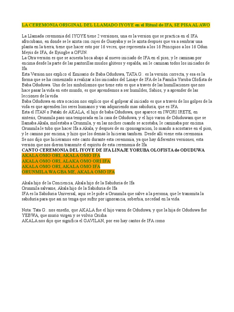 LA CEREMONIA ORIGINAL DEL LLAMADO IYOYE en el Ritual de IFA, SE PISA AL AWO