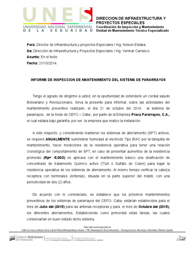 INFORME DE INSPECCION DE MANTENIMIENTO DEL SISTEMA DE PARARRAYOS