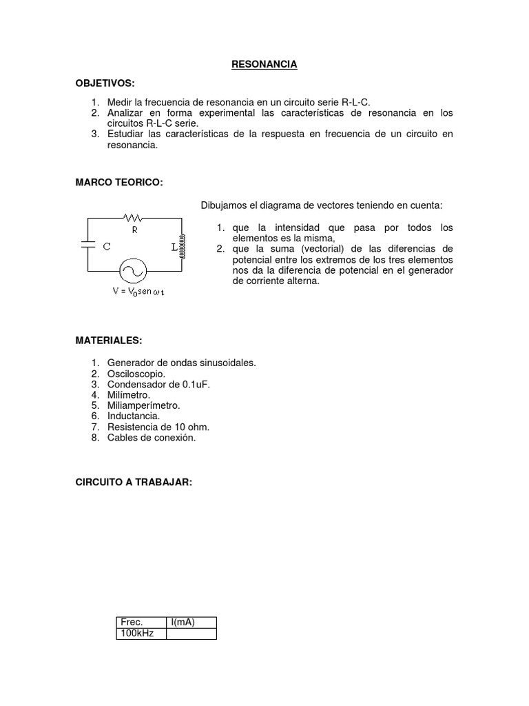 1. Medir la frecuencia de resonancia en un circuito serie R-L-C.