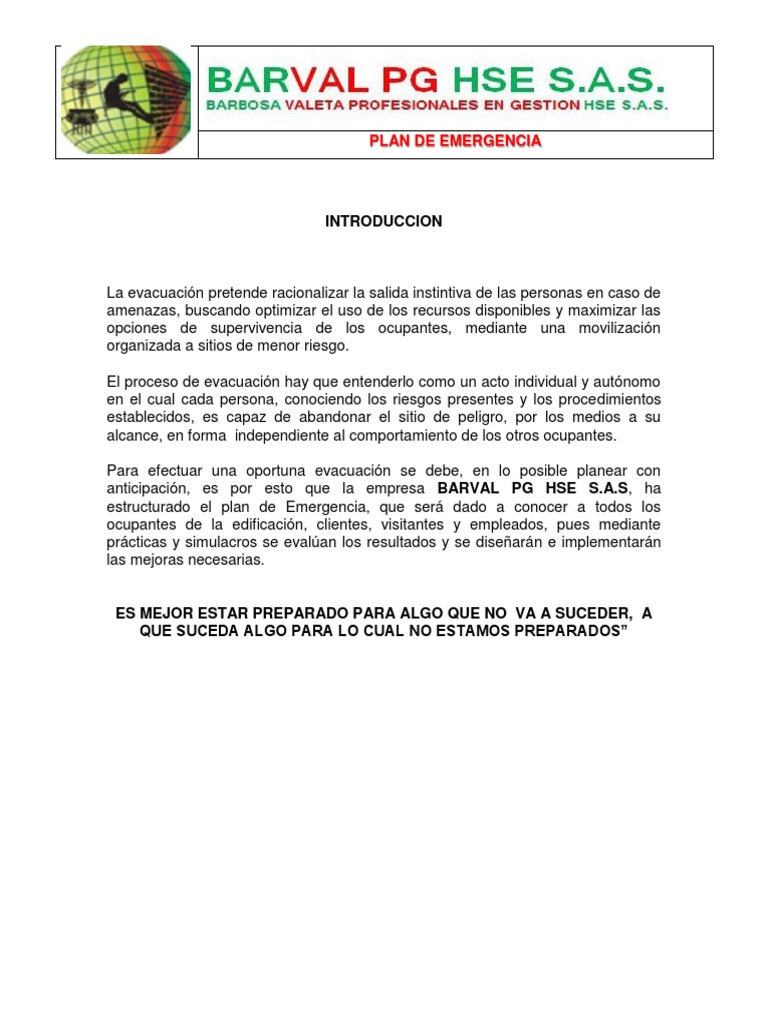 Disear e implementar el Plan de Emergencia para la empresa BARVAL PG HSE