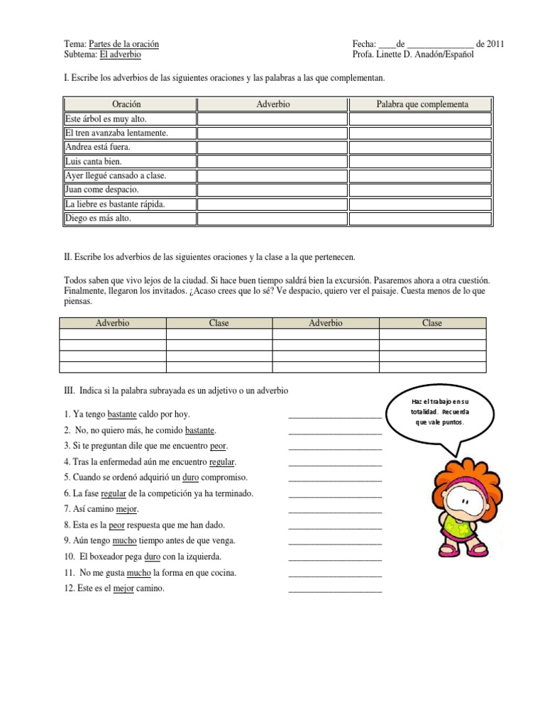 I. Escribe los adverbios de las siguientes oraciones y las palabras a las que complementan.