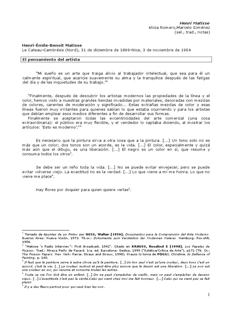 "Matisse 's Radio Interview": First Broadcast, 1942". Citado en KRAUSS, Rosalind E [1998]. Los Papeles de