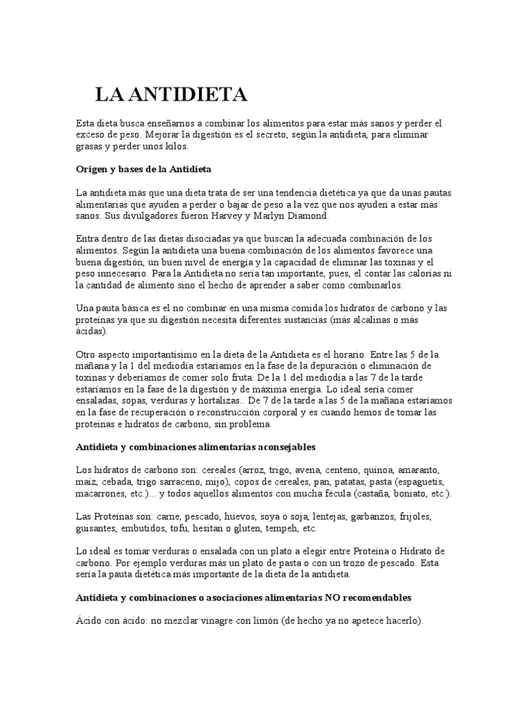 alimentos. Segn la antidieta una buena combinacin de los alimentos favorece una