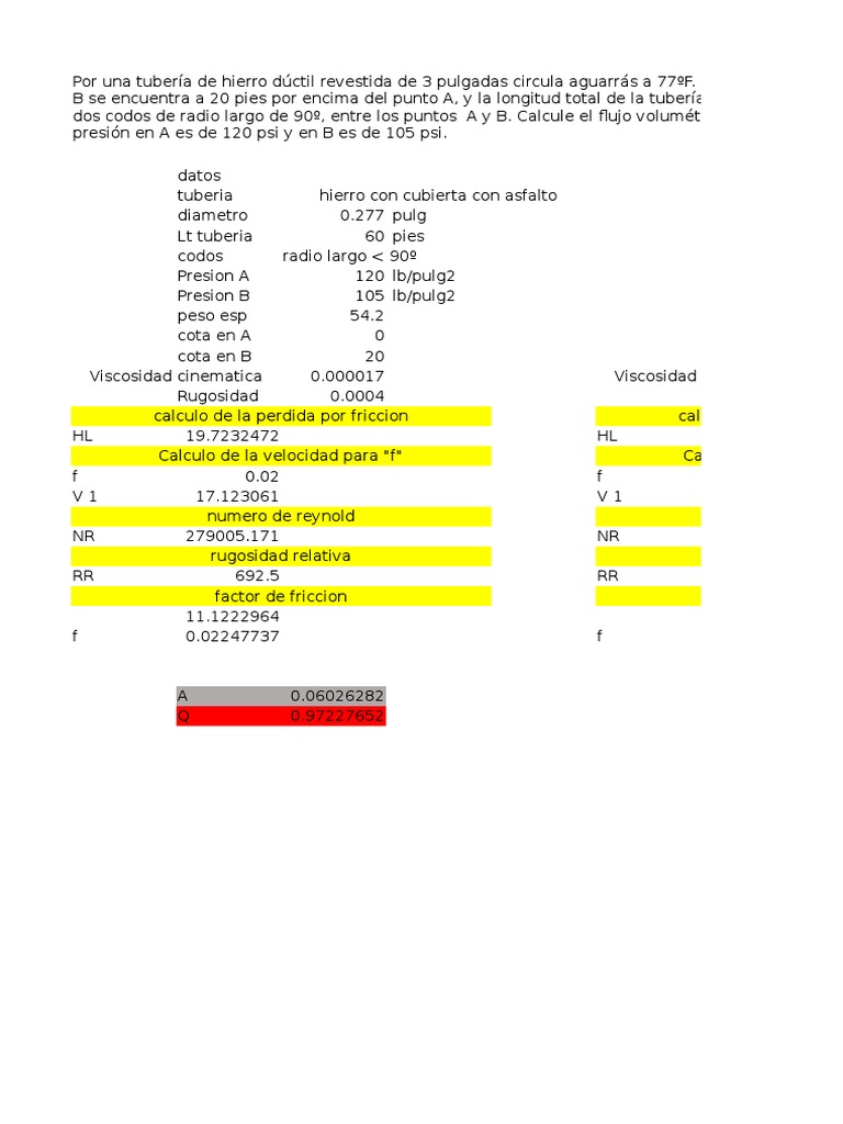 Por una tubera de hierro dctil revestida de 3 pulgadas circula aguarrs a 77F. Del punto A al B.