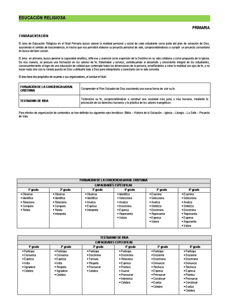 El rea en primaria, busca generar la capacidad analtica, reflexiva y vivencial como expresin de la Doctrina en su vida cotidiana y como propuesta de la Iglesia.