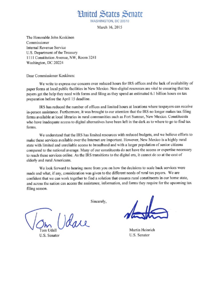 This week, U.S. Sens. Tom Udall and Martin Heinrich sent a letter to the commissioner of the Internal Revenue Service (IRS) to express concerns about cuts to services, particuarly for rural …Descripción completa