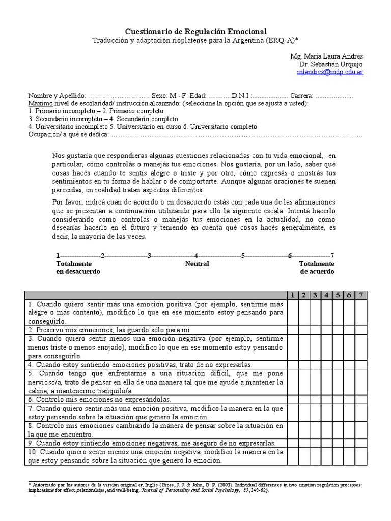 * Autorizado por los autores de la versin original en Ingls (Gross, J. J. & John, O. P. (2003). Individual differences in two emotion regulation processes: