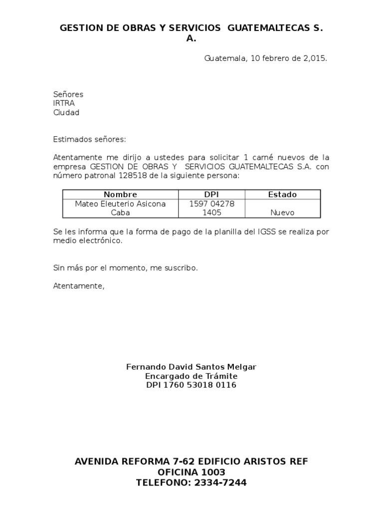 Atentamente me dirijo a ustedes para solicitar 1 carn nuevos de la