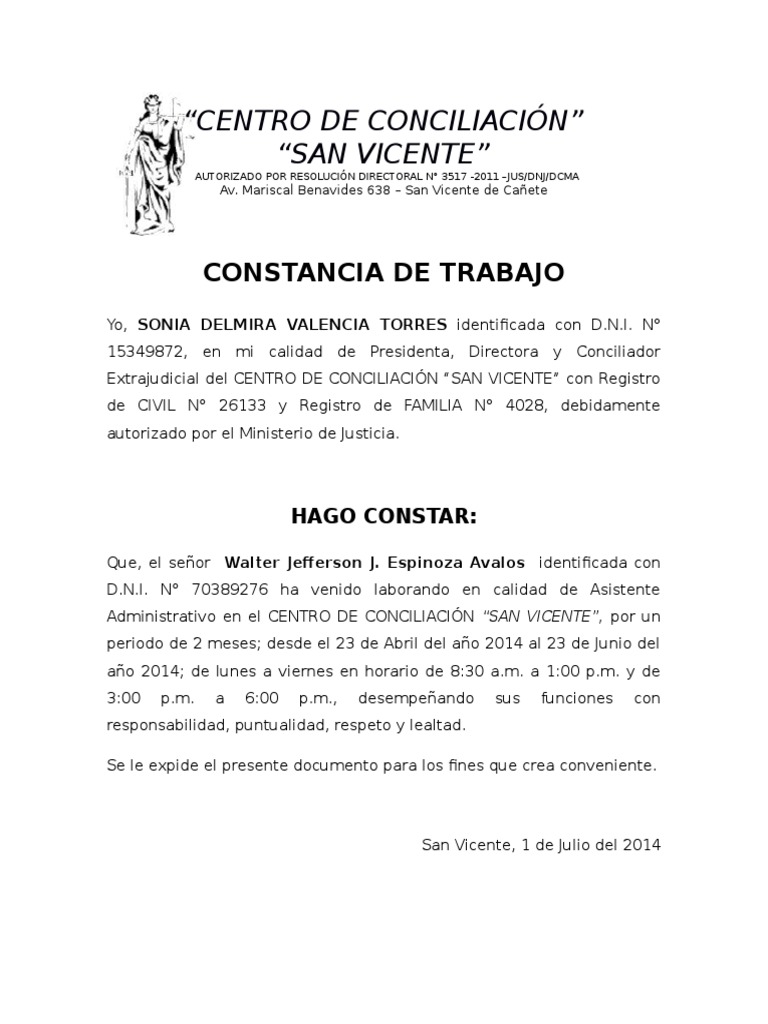 Extrajudicial del CENTRO DE CONCILIACIN SAN VICENTE con Registro