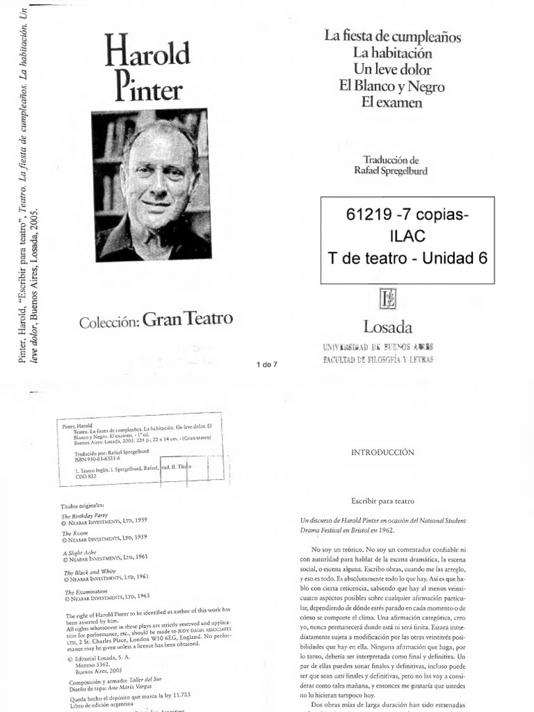 Pinter, Harold, Escribir para teatro, Teatro. La fiesta de cumpleaos. La habitacin.