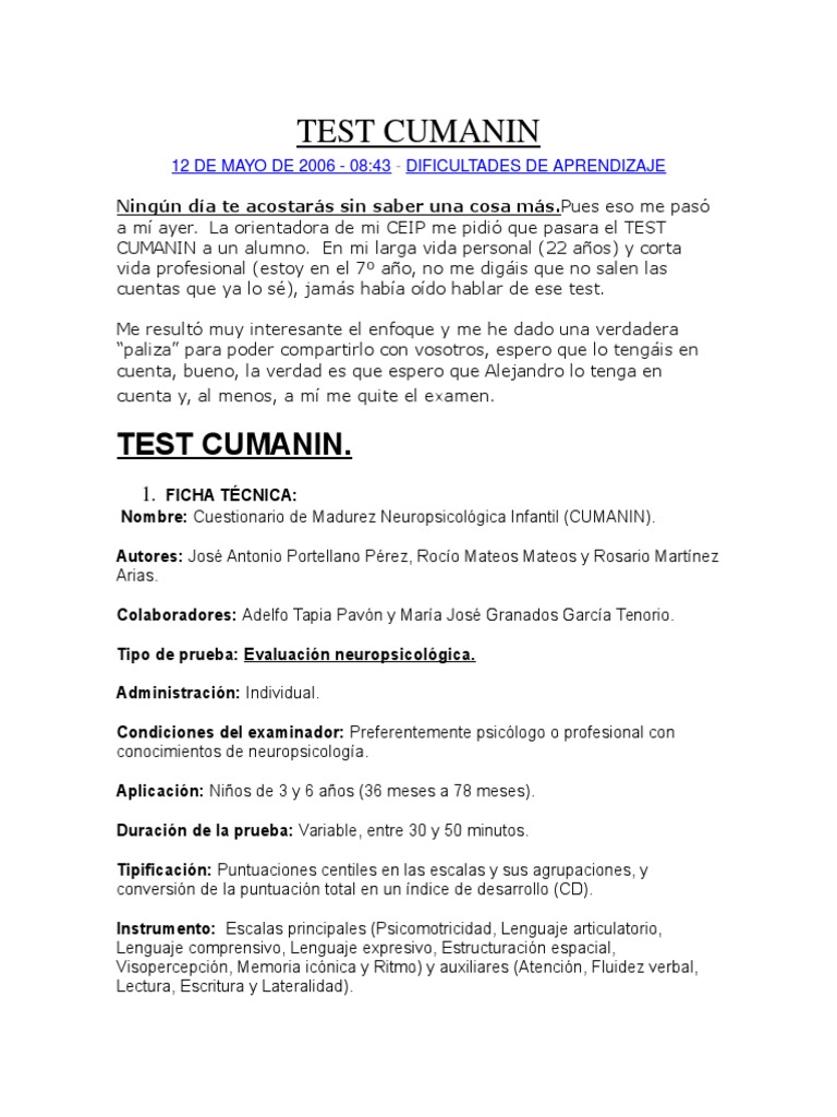 Nombre: Cuestionario de Madurez Neuropsicolgica Infantil (CUMANIN).