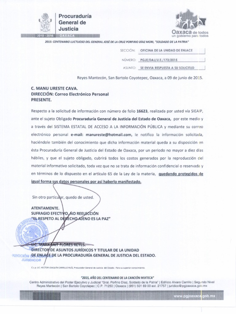 ante el sujeto Obligado Procuraduria General de Justicia del Estado de Oaxaca, por este medio y