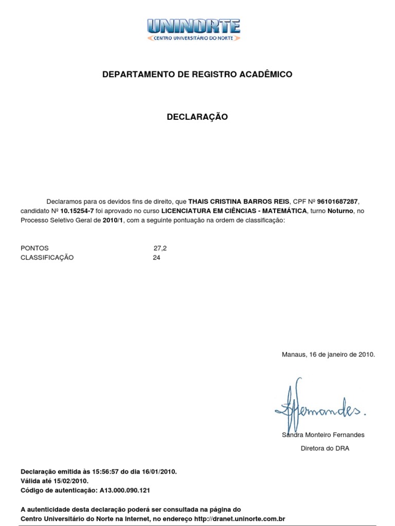 A autenticidade desta declaração poderá ser consultada na página do Centro Universitário do Norte na Internet, no endereço http://dranet.uninorte.com.br