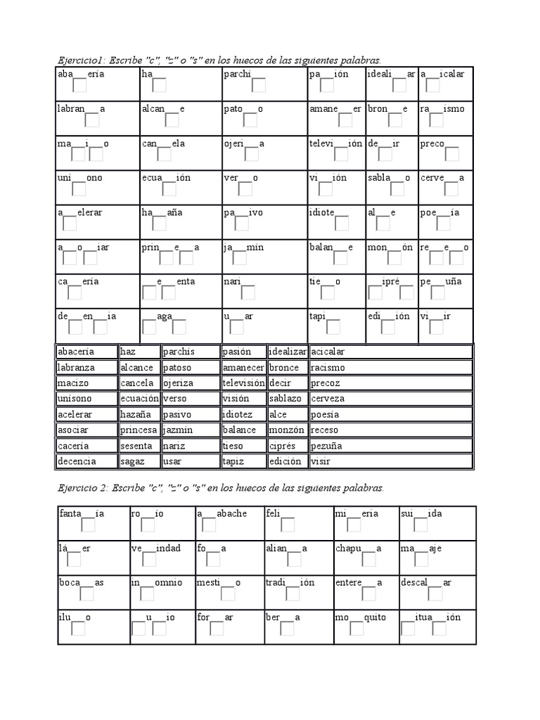 Ejercicio1: Escribe "c", "z" o "s" en los huecos de las siguientes palabras.