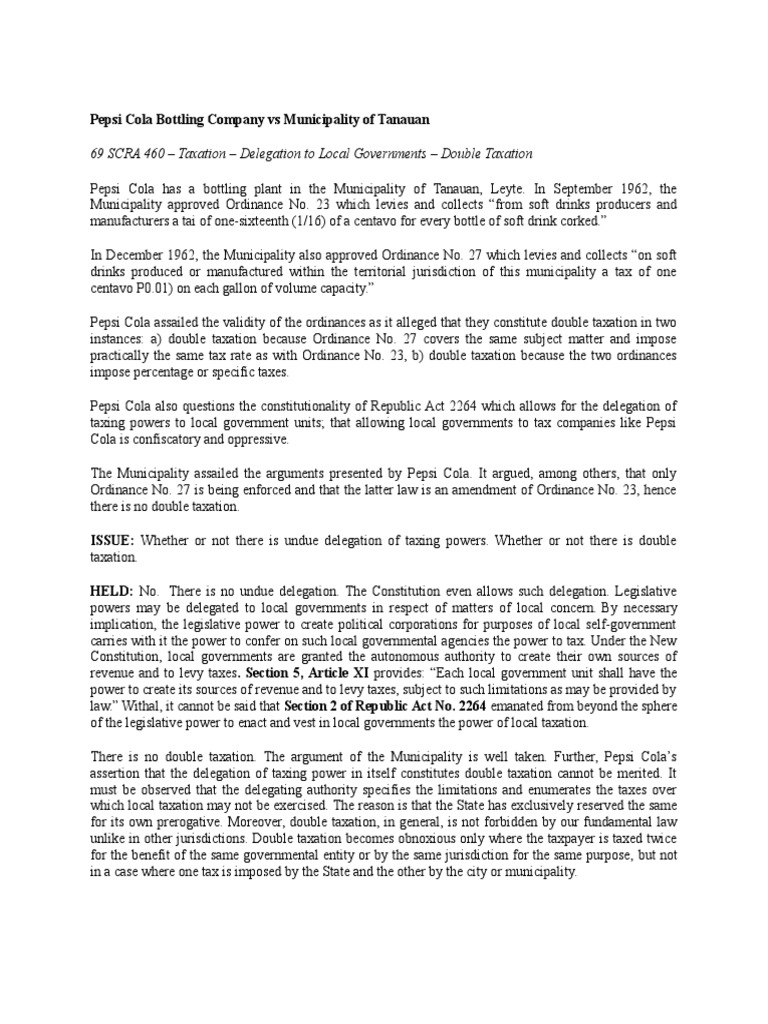 Pepsi Cola assailed the validity of the ordinances as it alleged that they constitute double taxation in two
