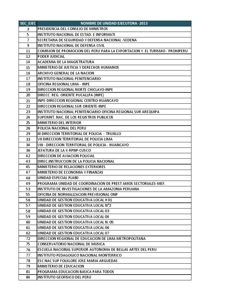 NOMBRE DE UNIDAD EJECUTORA -2013