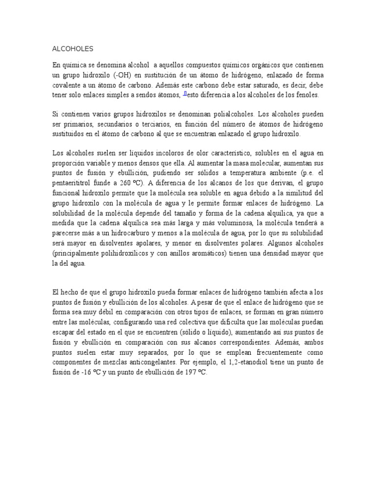 Los alcoholes suelen ser lquidos incoloros de olor caracterstico, solubles en el agua en