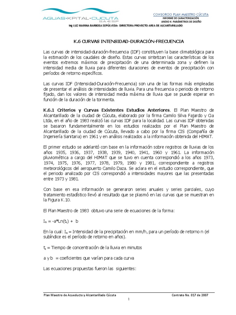 Ltda, en el ao de 1983 realiz las curvas IDF para la localidad. Las curvas IDF obtenidas
