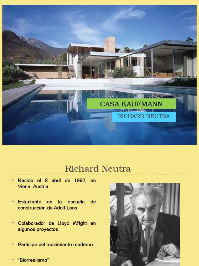 Análisis de la Casa Kaufmann, realizada por el gran arquitecto Richard Neutra, presentando también detalles de la vida del autor.
