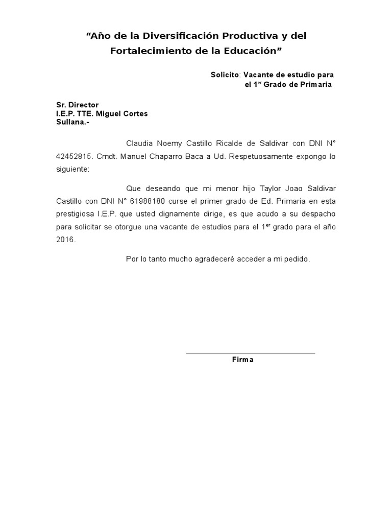para solicitar se otorgue una vacante de estudios para el 1 er grado para el ao