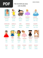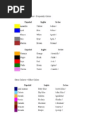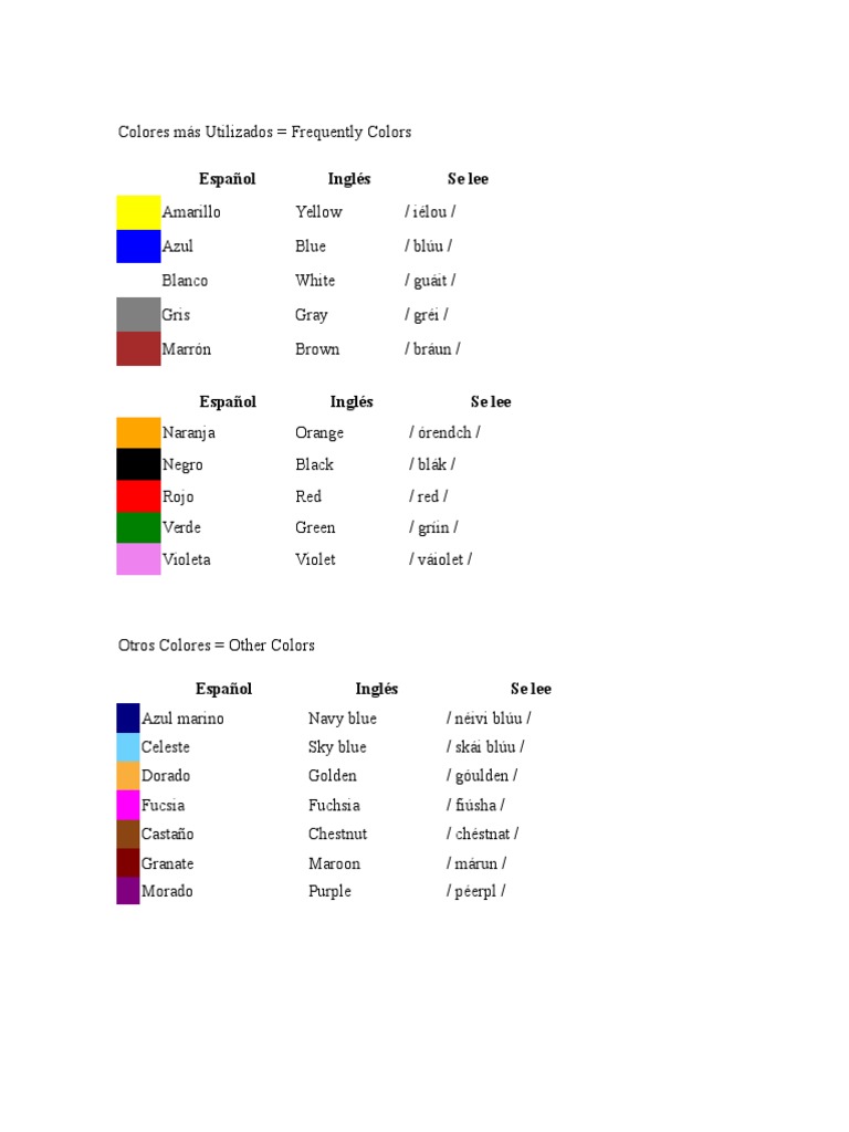 El documento lista los colores más comunes en español e inglés, incluyendo amarillo, azul, blanco, gris, marrón, naranja, negro, rojo y verde. También incluye otros colores menos comunes como azul marino, celeste, dorado, fucsia, castaño y granate.