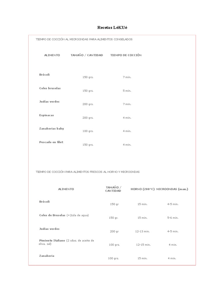 El documento proporciona tablas con los tiempos de cocción recomendados para diferentes verduras, frutas y proteínas tanto congeladas como frescas en el horno y el microondas. Para los alimentos congelados, recomienda de 4 a 7 minutos en el microondas para verduras como brócoli, coles de Bruselas, judías verdes y espinacas, y 4 minutos para pescado en filetes. Para los alimentos frescos, da un rango de tiempos para el horno y el microondas para cada alimento.