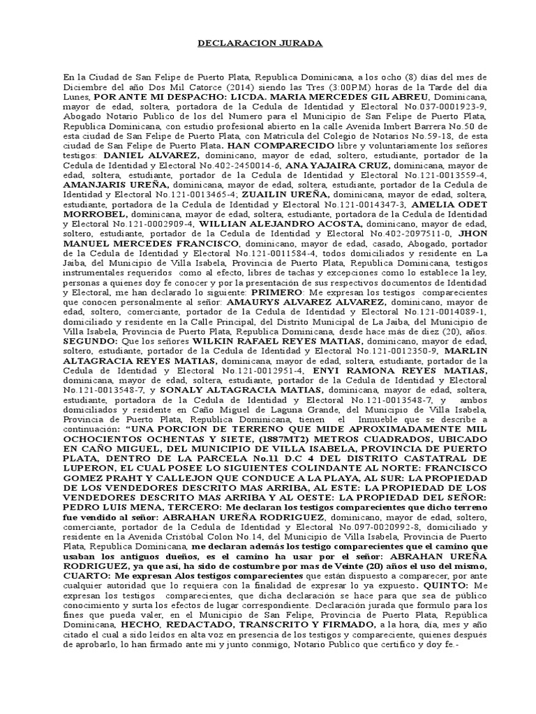 Plata, Republica Dominicana, me declaran adems los testigo comparecientes que el camino que