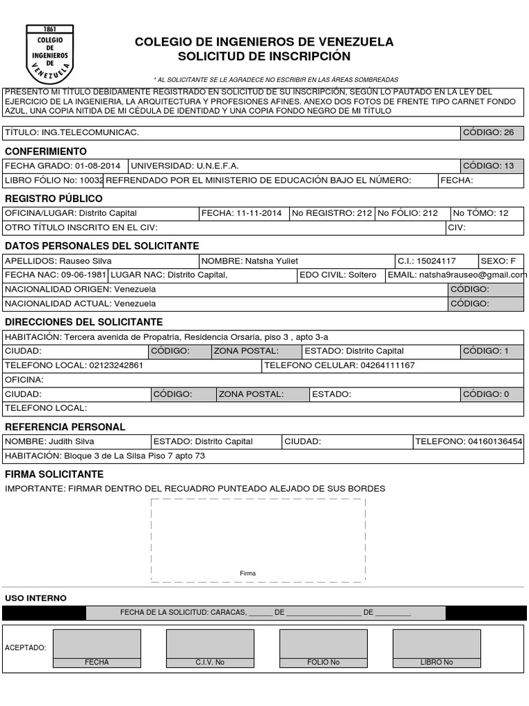 PRESENTO MI TTULO DEBIDAMENTE REGISTRADO EN SOLICITUD DE SU INSCRIPCIN, SEGN LO PAUTADO EN LA LEY DEL