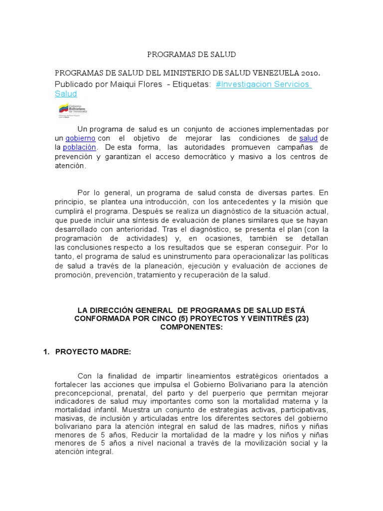 PROGRAMAS DE SALUD DEL MINISTERIO DE SALUD VENEZUELA 2010.
