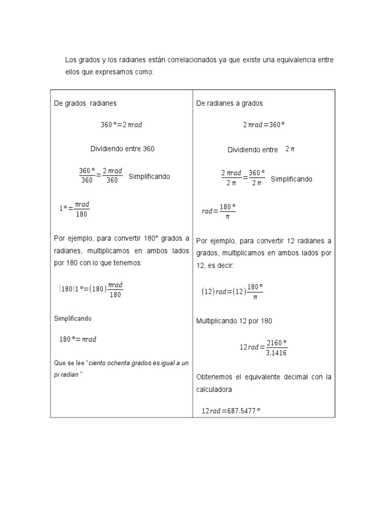 Los grados y los radianes estn correlacionados ya que existe una equivalencia entre