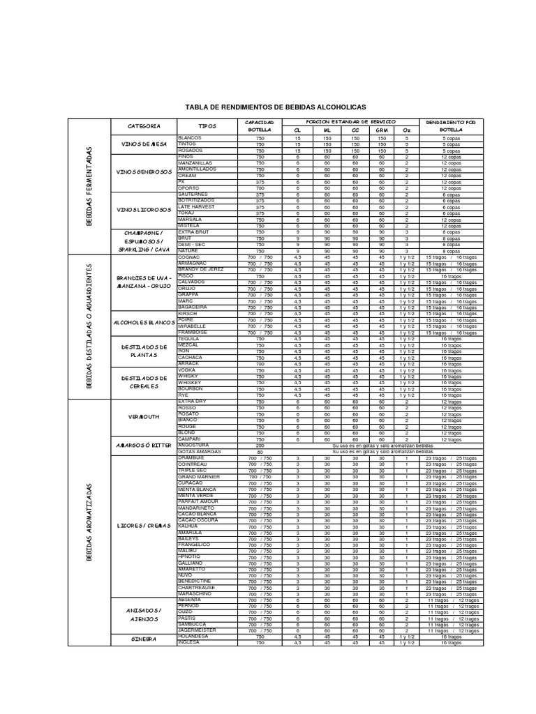 TABLA DE RENDIMIENTOS DE BEBIDAS ALCOHOLICAS