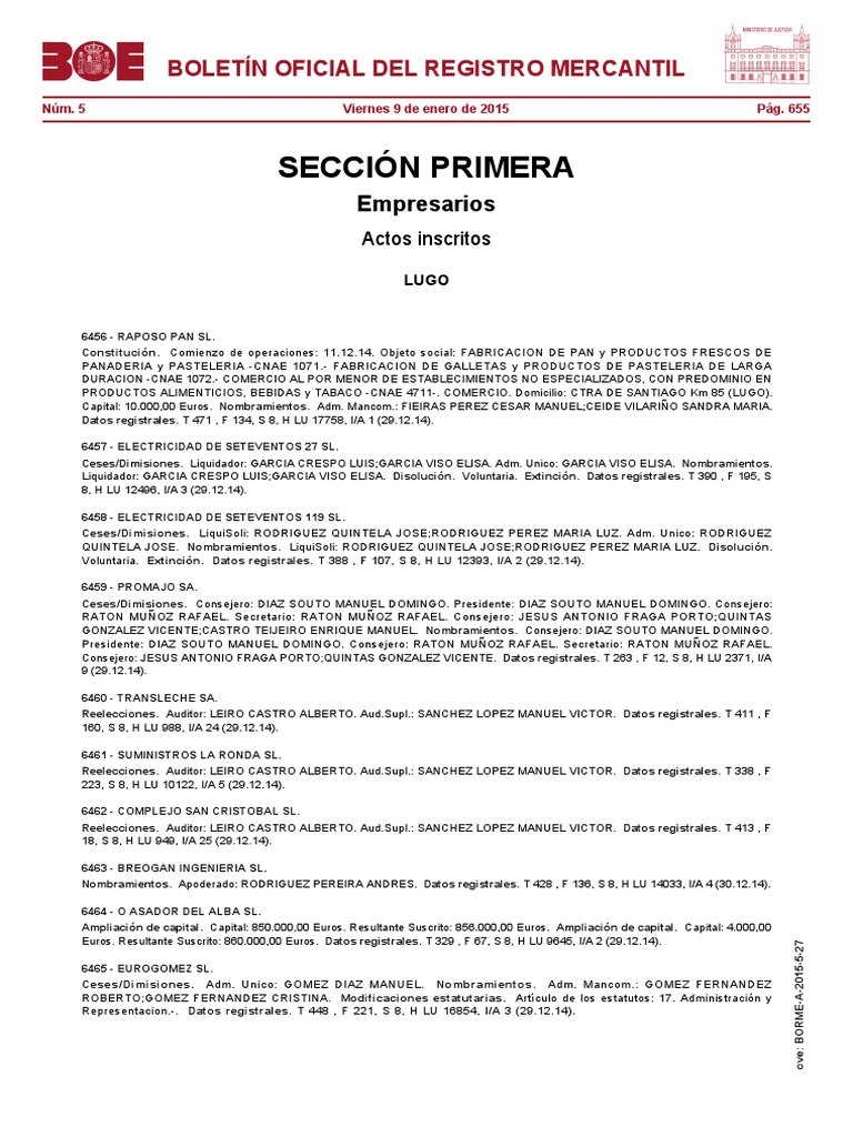 FRANCISCO JAVIER;DOVAL CARRACEDO ESTEFAN. Datos registrales. T 471 , F 151, S 8, H LU 17762, I/A 1 (30.12.14).