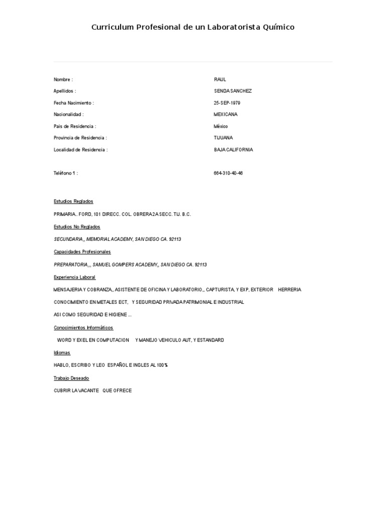 Curriculum Profesional de un Laboratorista Qumico
