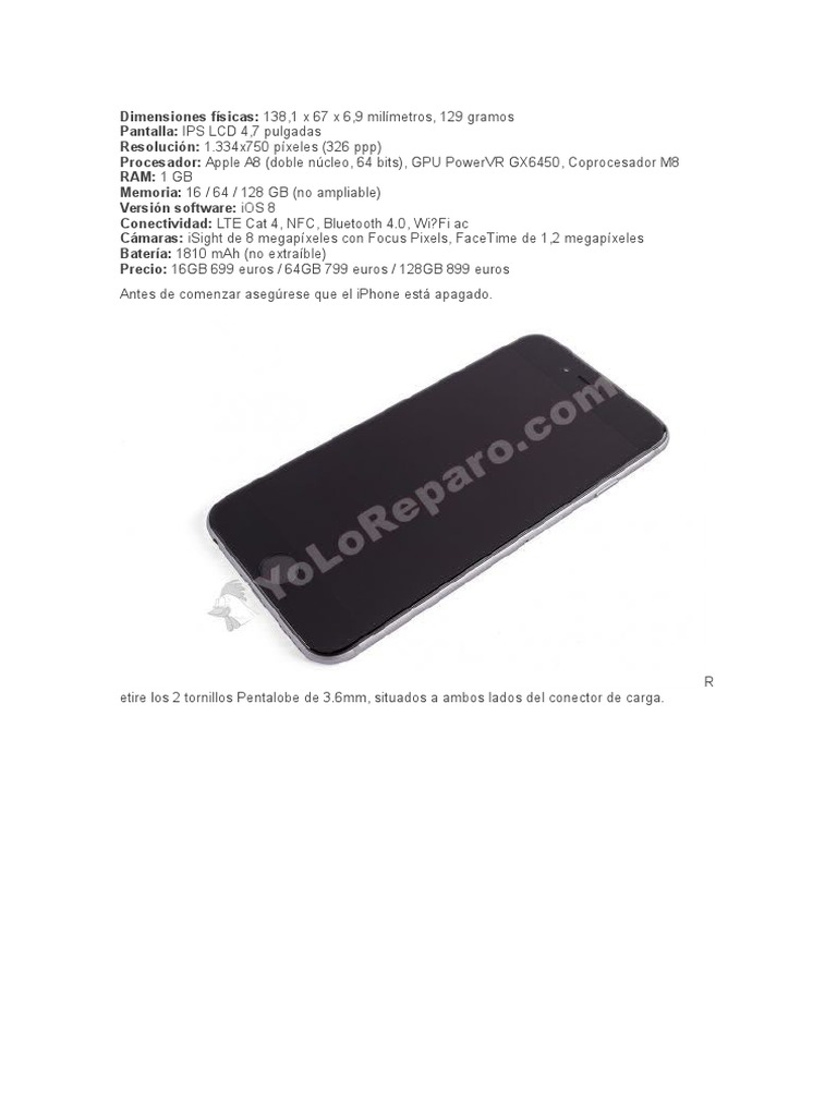 Procesador: Apple A8 (doble ncleo, 64 bits), GPU PowerVR GX6450, Coprocesador M8